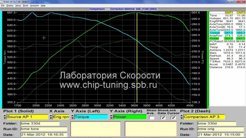 21 марта 2012 года выполнены замеры мощности и крутящего момента до и после чип-тюнинга автомобиля BMW 330d с дизельным двигателем 3.0