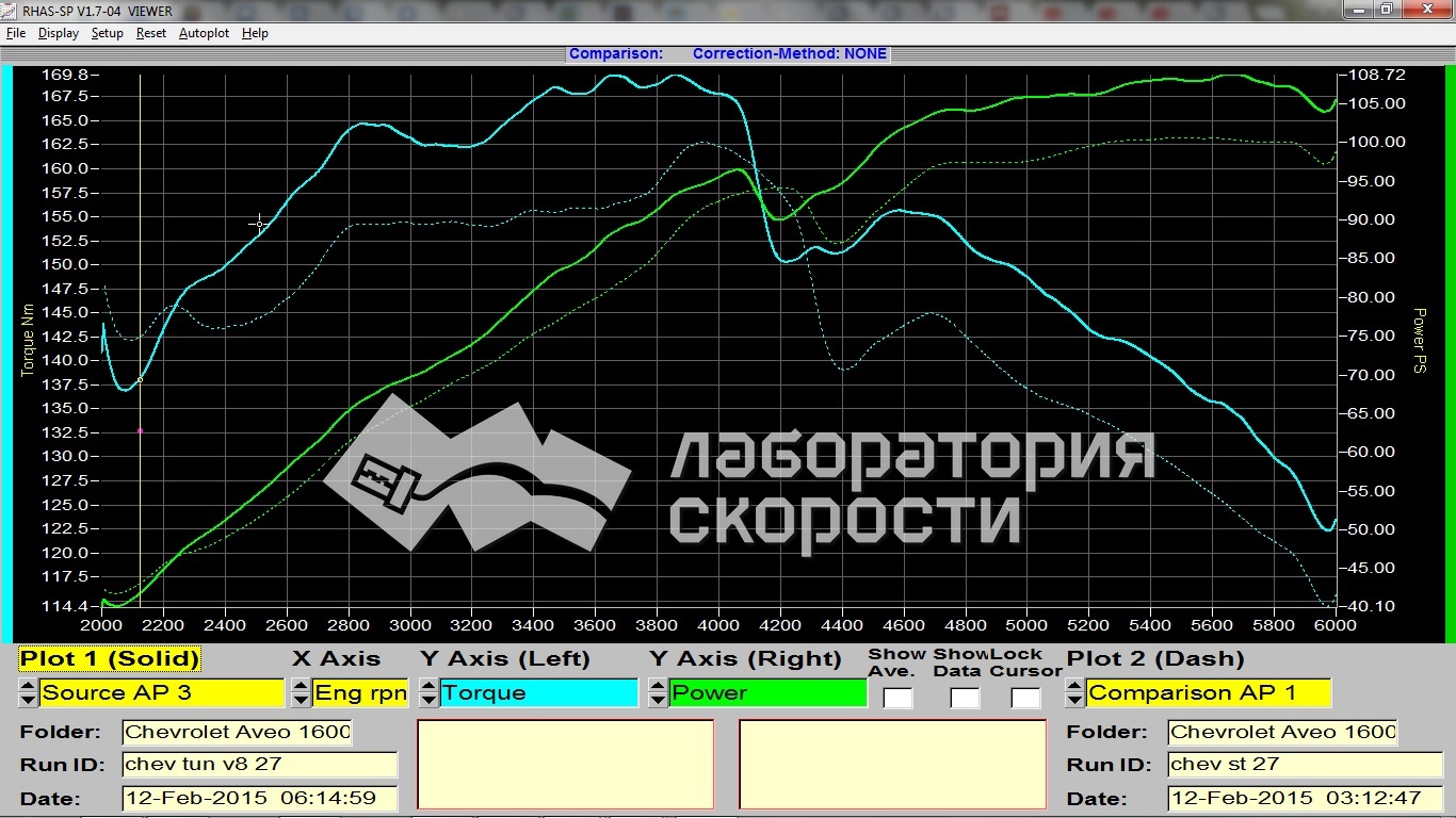 12 февраля 2015 года произведены замеры мощности и крутящего момента автомобиля Chevrolet Aveo New 1,6 (заявленная заводом мощность - 116 л.с., блок управления AC Delco E39A).