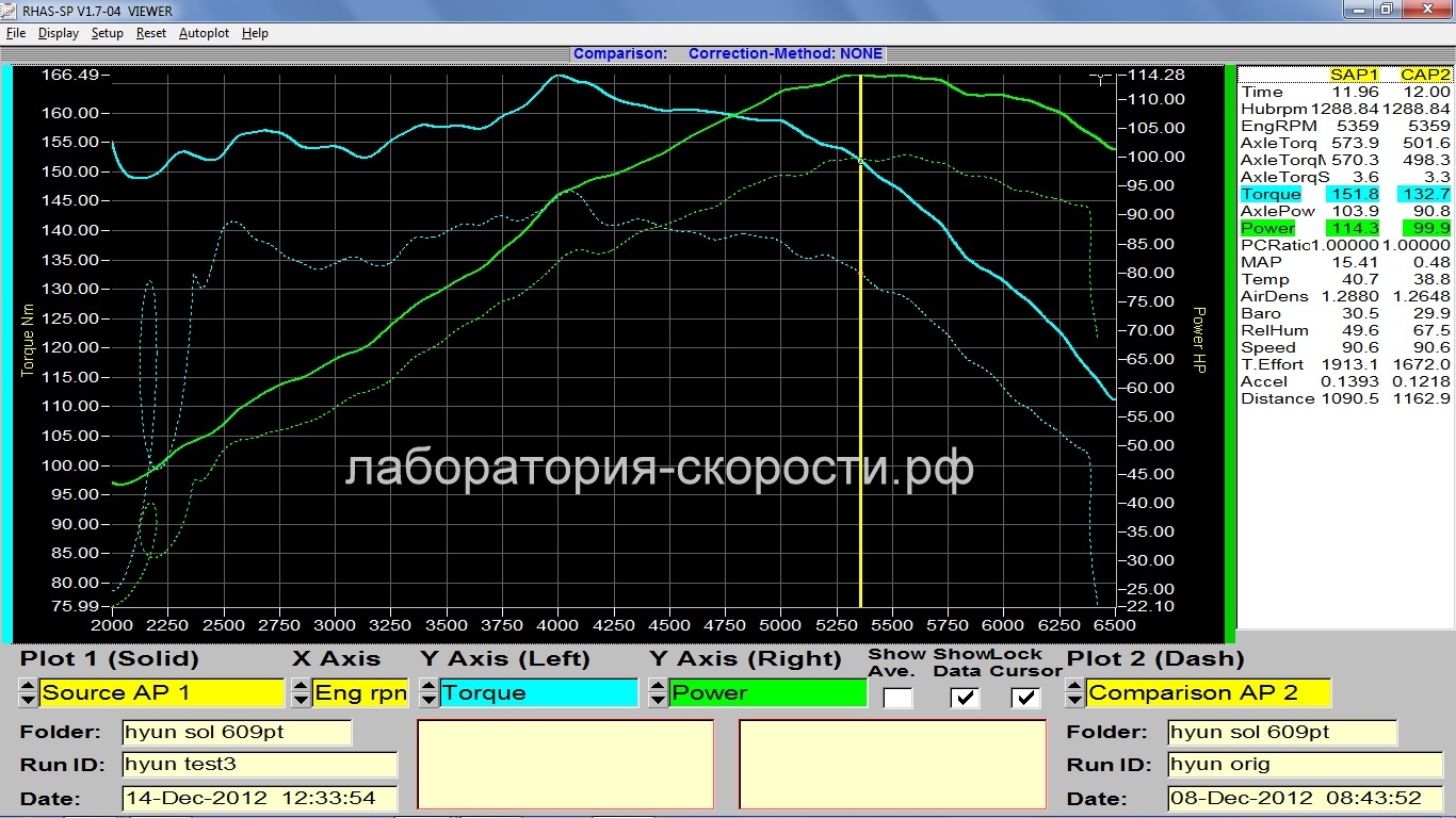 14 декабря 2012 года. Были произведены замеры мощности и крутящего момента до и после чип-тюнинга автомобиля Hyundai Solaris 1.6i