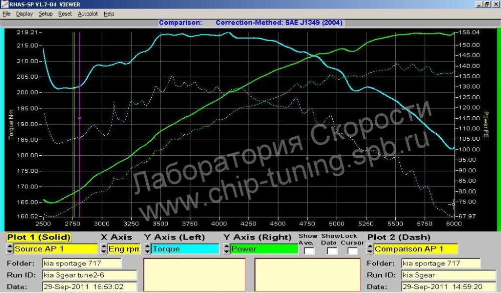29 сентября 2011 года произведены замеры мощности и крутящего момента автомобиля KIA Sportage II с мотором 2.7.
