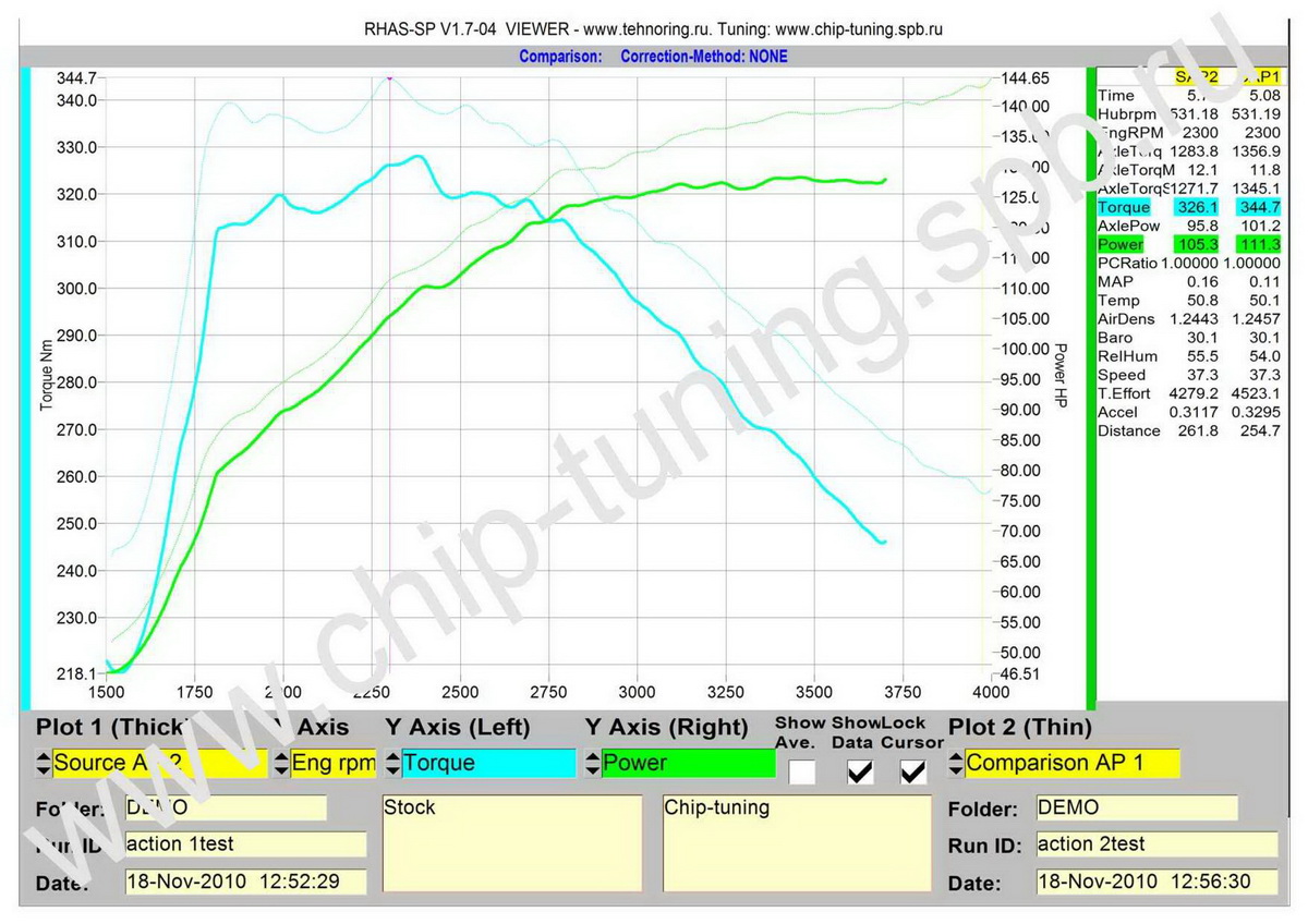Произведены замеры результатов чип-тюнинга автомобиля Ssang Yong Actyon 2.0 XDI. Замер проводился 18.11.2010 на стенде стадиона технических видов спорта "Техноринг".